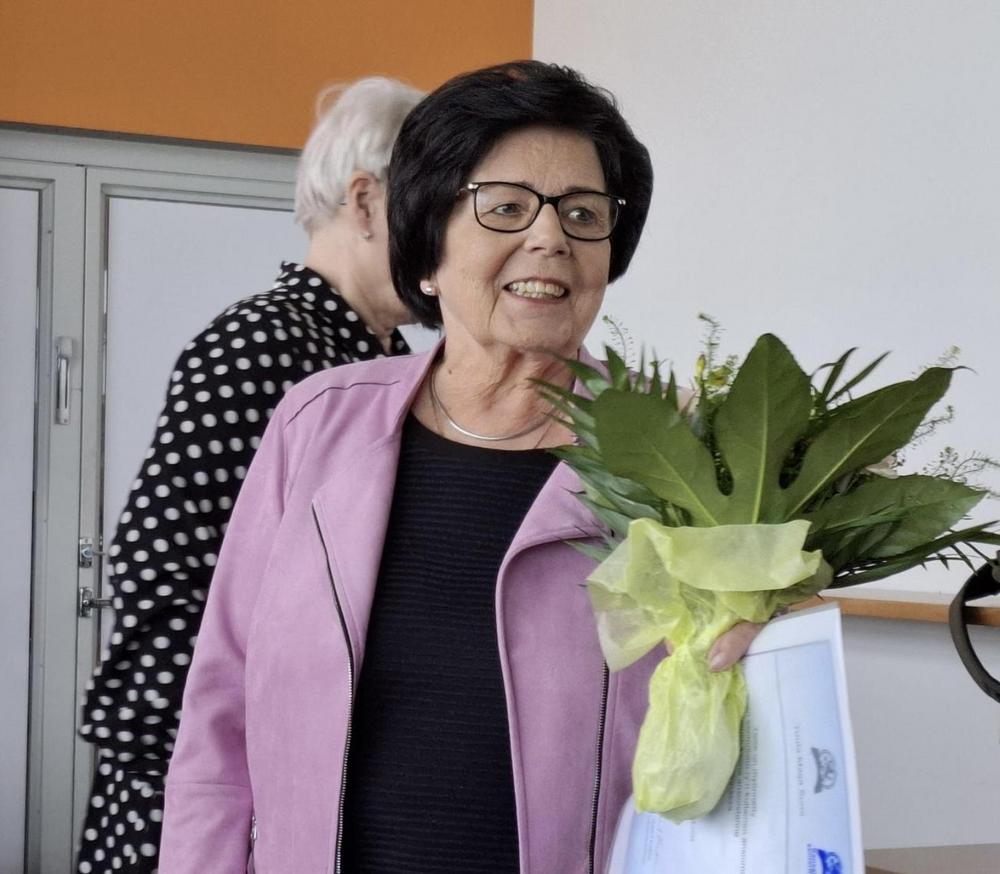 Lounaan jälkeen luovutettiin piirin monivuotiselle taloudenhoitajalle Maija Sumille Senioriliiton kultainen ansiomerkki. Lämpimät onnittelut Maijalle!